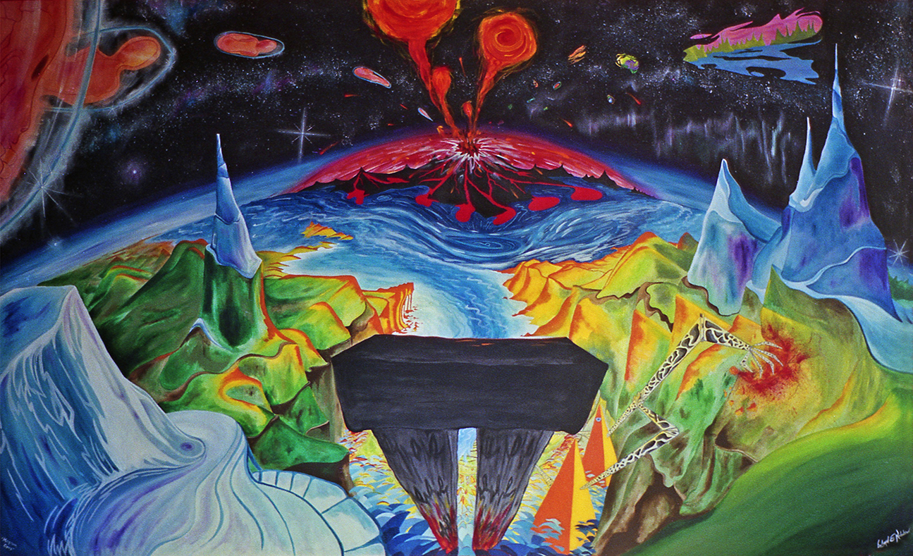 A blast from the past. In 1974 I created this painting, but I completely reworked it in 1984. I re-titled "Magnum Opus", and to that date, it was. In 1968, shortly after its release, I saw the film "2001 A Space Odyssey" with my oldest brother and was terrified and awed by that film, but it profoundly influenced my own thinking about film making and art. This painting below is about the end of an old world, represented by the Try-glyph (a symbol of tyranny) and the destruction of the environment, and the dawning of a utopia. Yup. Big idea's back then!