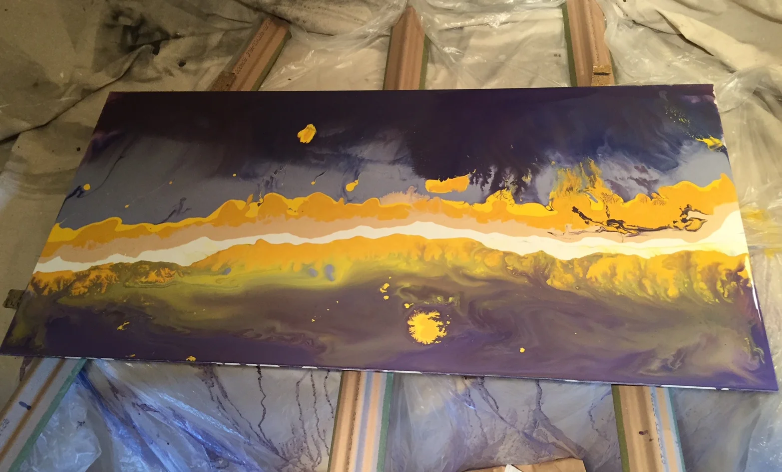 Just poured the 2nd half. There is more that I will be doing on this. I had several small bugs land and dry on the first section, and I don't want them there so I will be removing those, and I need to clean up the white banding running nearly through the middle, plus I will be adding a band of gold along the perimeter of the white section. Because the new section is still wet in this picture, it will dry darker still.