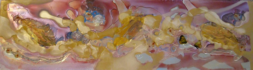 My earliest work had been quite structured and restrained, and feeling that I was breaking free from that, I began to explore work that was expressive yet abstract. I did not want total control in the process. I had a vision of the work being free flowing, reminiscent of satellite or microscopic images, and I saw it as semi translucent. It was then that I hit on the idea of working directly on Plexiglas and press-board to achieve my vision.